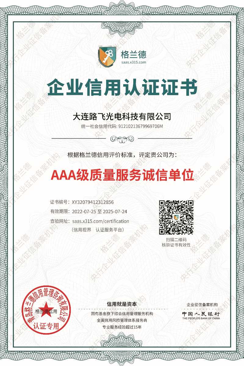 • 大连路飞光电科技有限公司3A级信用企业